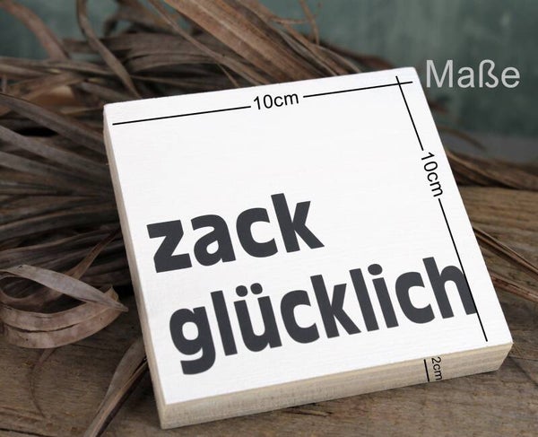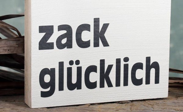 Das hochwertige Multiplexbuchenholz besticht durch seine mattweiße Oberfläche, welche mit geplotteter Vinylfolie in den mattschwarzen Lettern " zack glücklich " aufgewertet wurde.