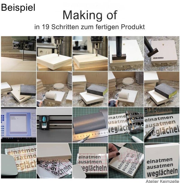 Das hochwertige Multiplexbuchenholz besticht durch seine mattweiße Oberfläche, welche mit geplotteter Vinylfolie in mattschwarzen Lettern mit Ihrem Wunschtext aufgewertet wird.