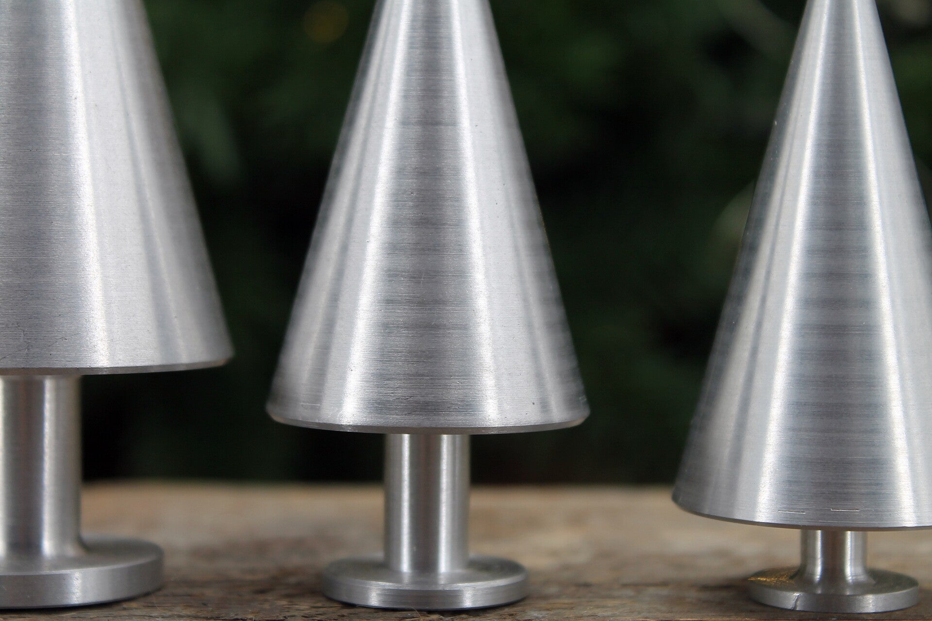 Die Bäume wurden aus einem Stück Vollmaterial Aluminium in unserer Werkstatt handgedreht und poliert.