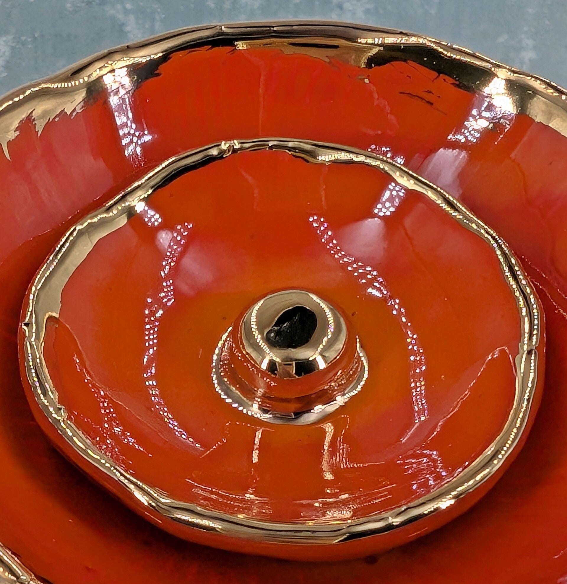 Durch den dreimaligen Brand und die unterschiedlichen Glasuren, jeweils mit echtem Gold (24Karat), ist jede Blüte ein eyecatcher.
