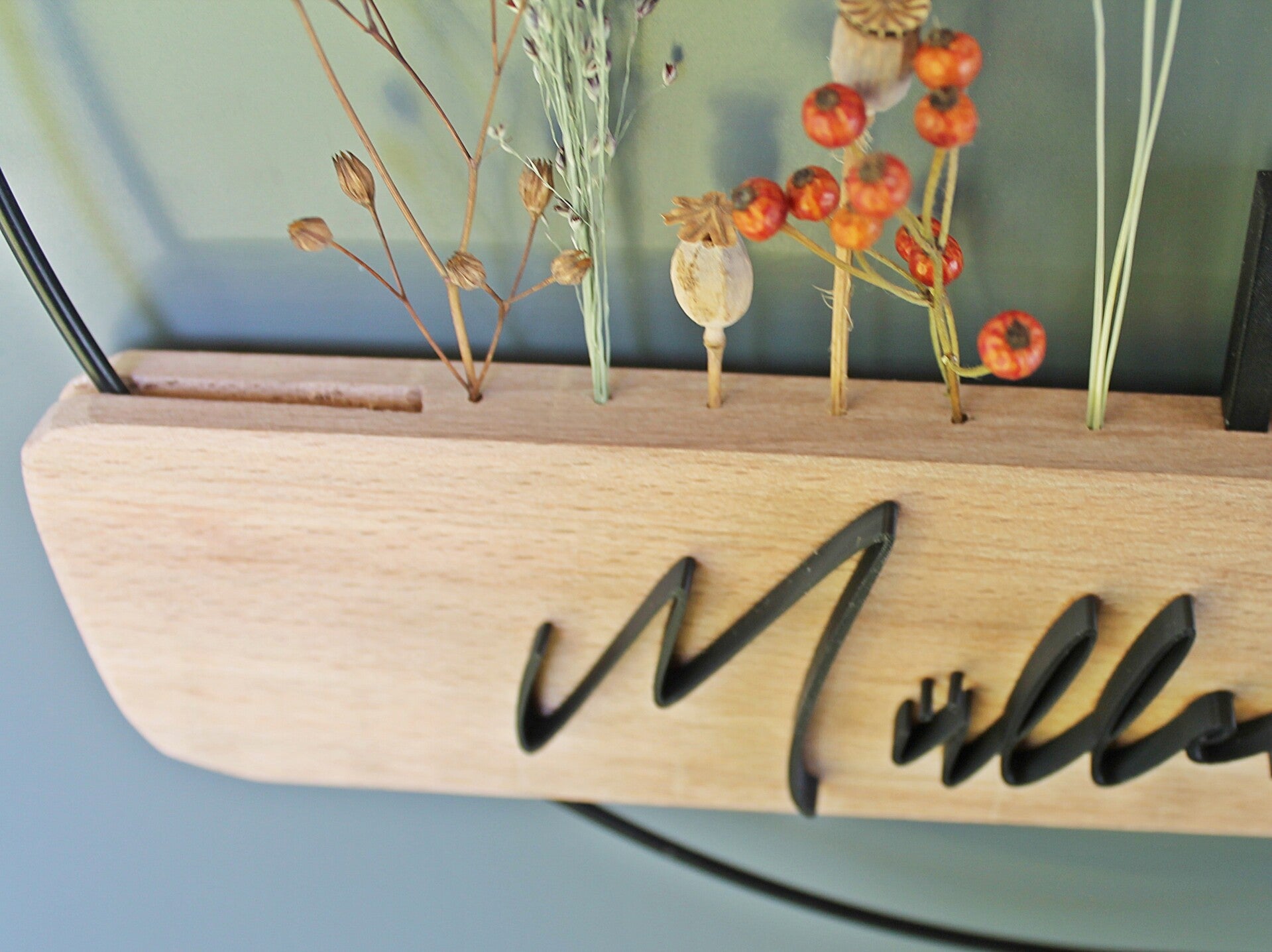 Trockenblumen, Gräser, Federn, oder was Ihnen die Natur beim nächsten Spaziergang vor die Füße wirft, können in den sechs Bohrungen nach Herzenslust (ver)dekoriert werden.