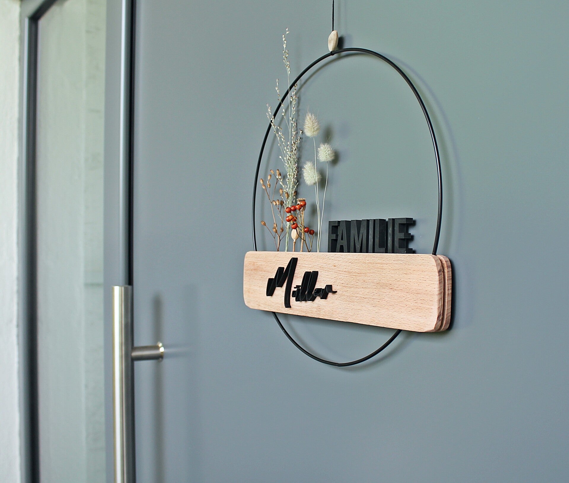 Der personalisierter Türkranz verbindet klare Linien, natürliche Buche und einem eleganten schwarzen Metallring.