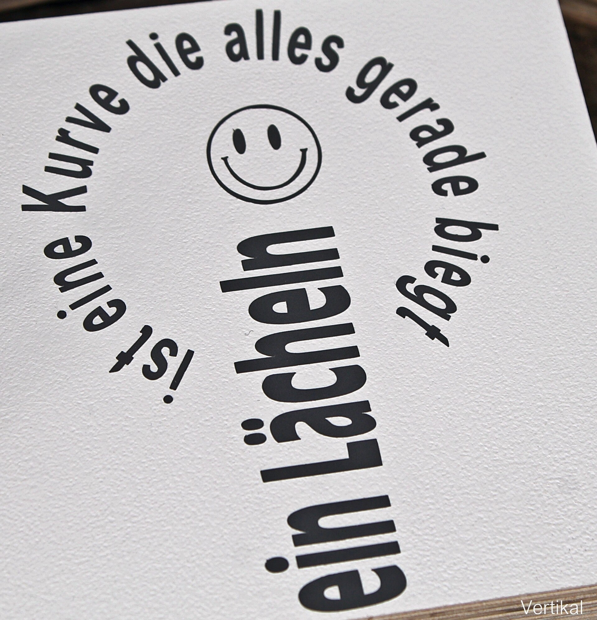 Das hochwertige Multiplexbuchenholz besticht durch seine mattweiße Oberfläche, welche mit geplotteter Vinylfolie in den mattschwarzen Lettern " ein Lächeln ist eine Kurve die alles gerade biegt " + Smileysymbol aufgewertet wurde.
