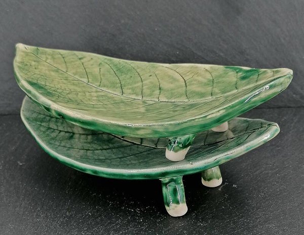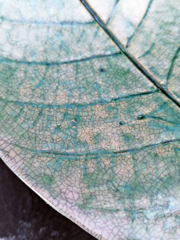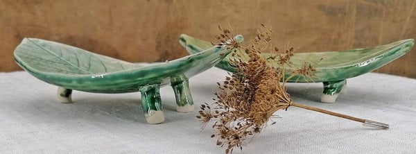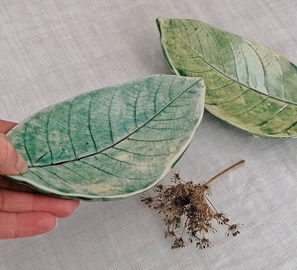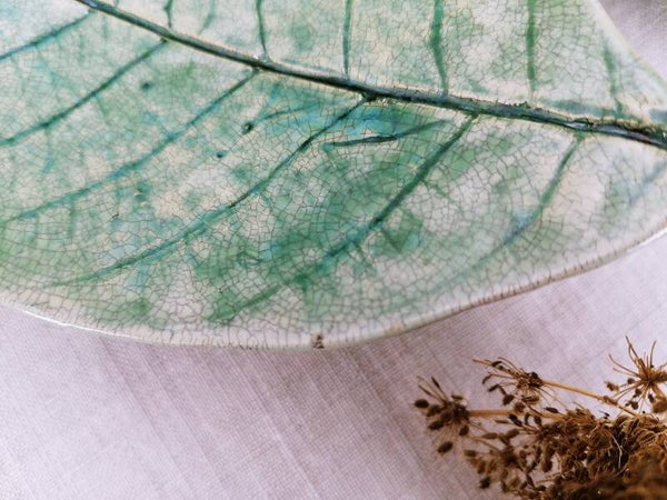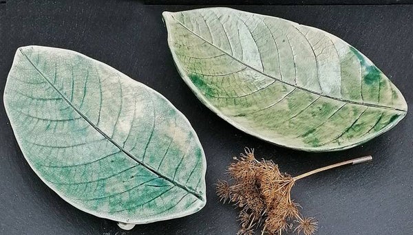 Echte Blätter standen bereit sich für immer im Ton niederzulassen um Autoschlüssel oder Schmuck entgegenzunehmen.